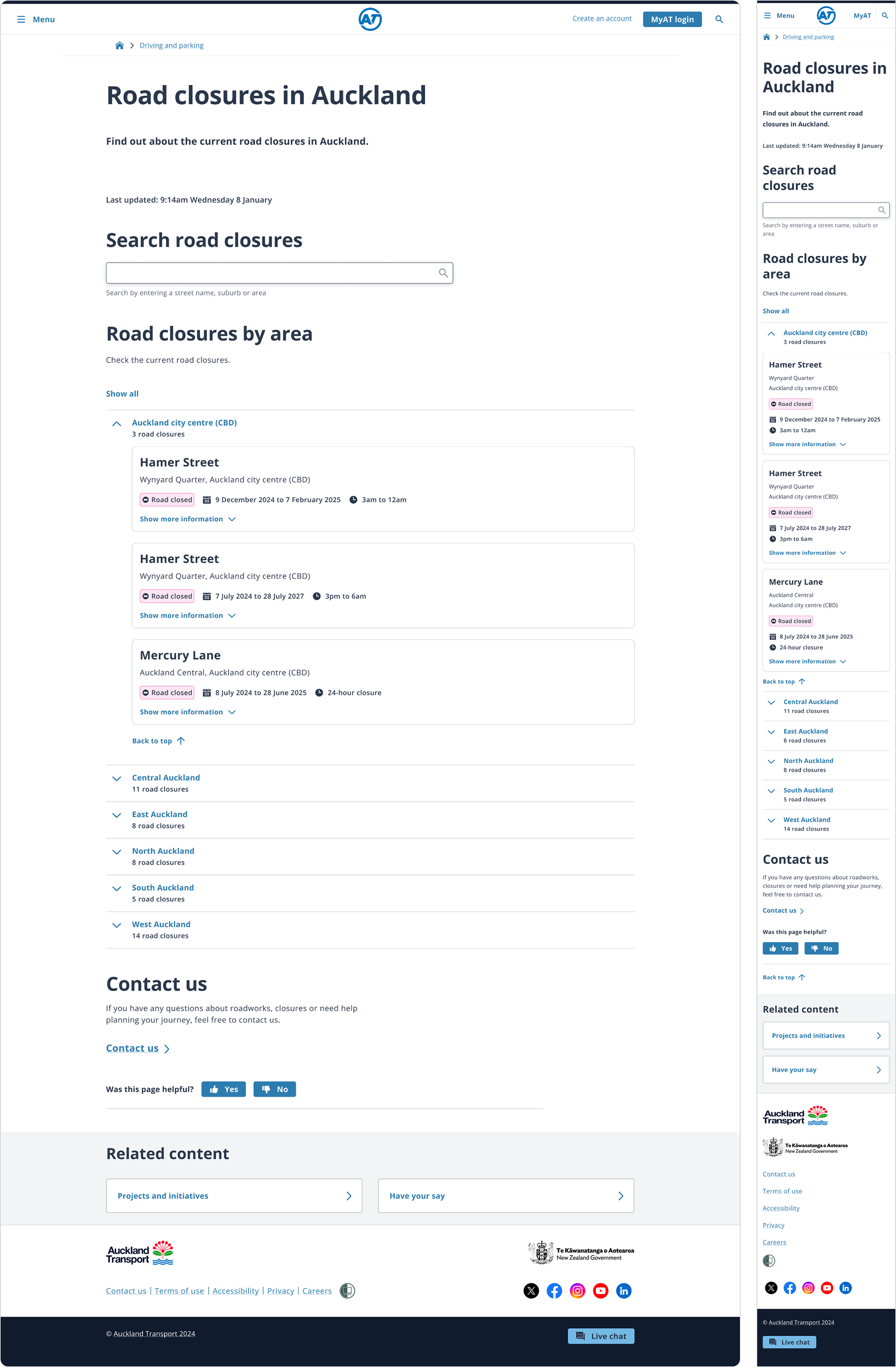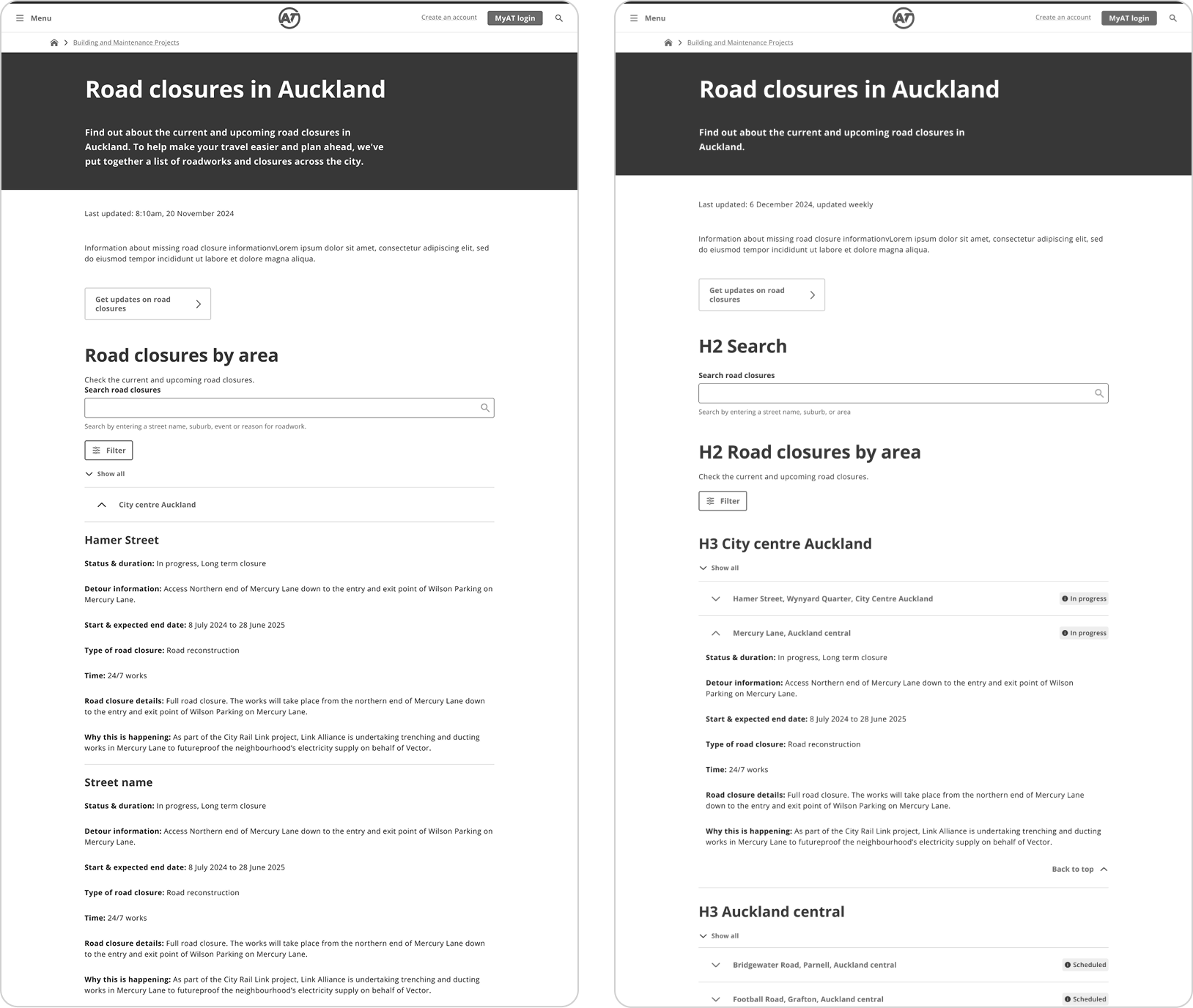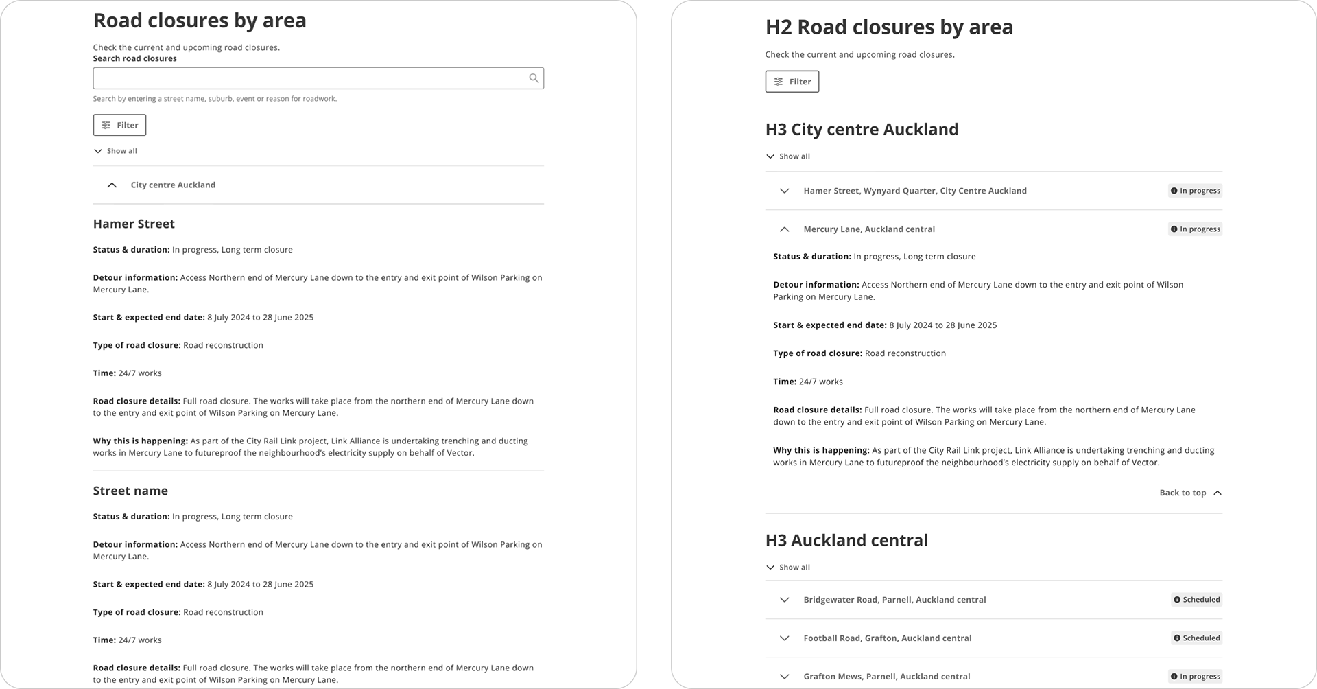 I added ‘x road closures’ to each area, included high-level information for each of the impacted roads in an expandable card so the user has more up-front information, added icons to the details so content is easier to scan, left aligned ‘back to top’ for better accessibility.