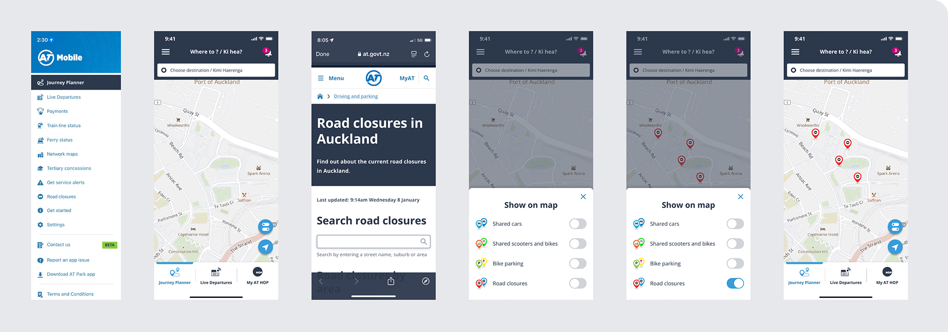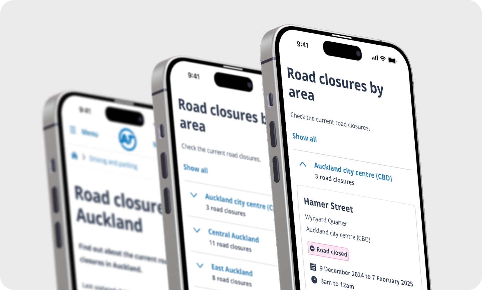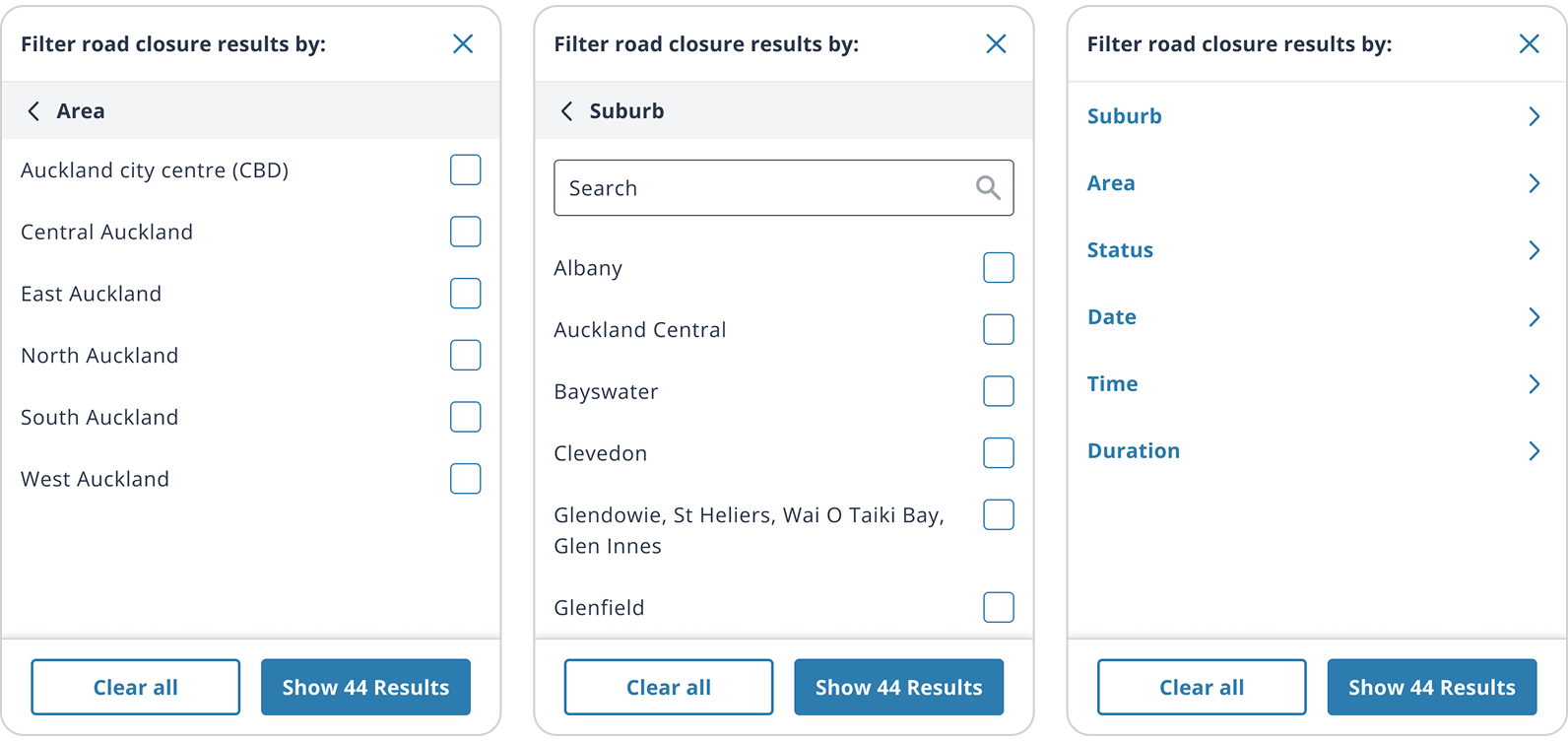 I added ‘x road closures’ to each area, included high-level information for each of the impacted roads in an expandable card so the user has more up-front information, added icons to the details so content is easier to scan, left aligned ‘back to top’ for better accessibility.